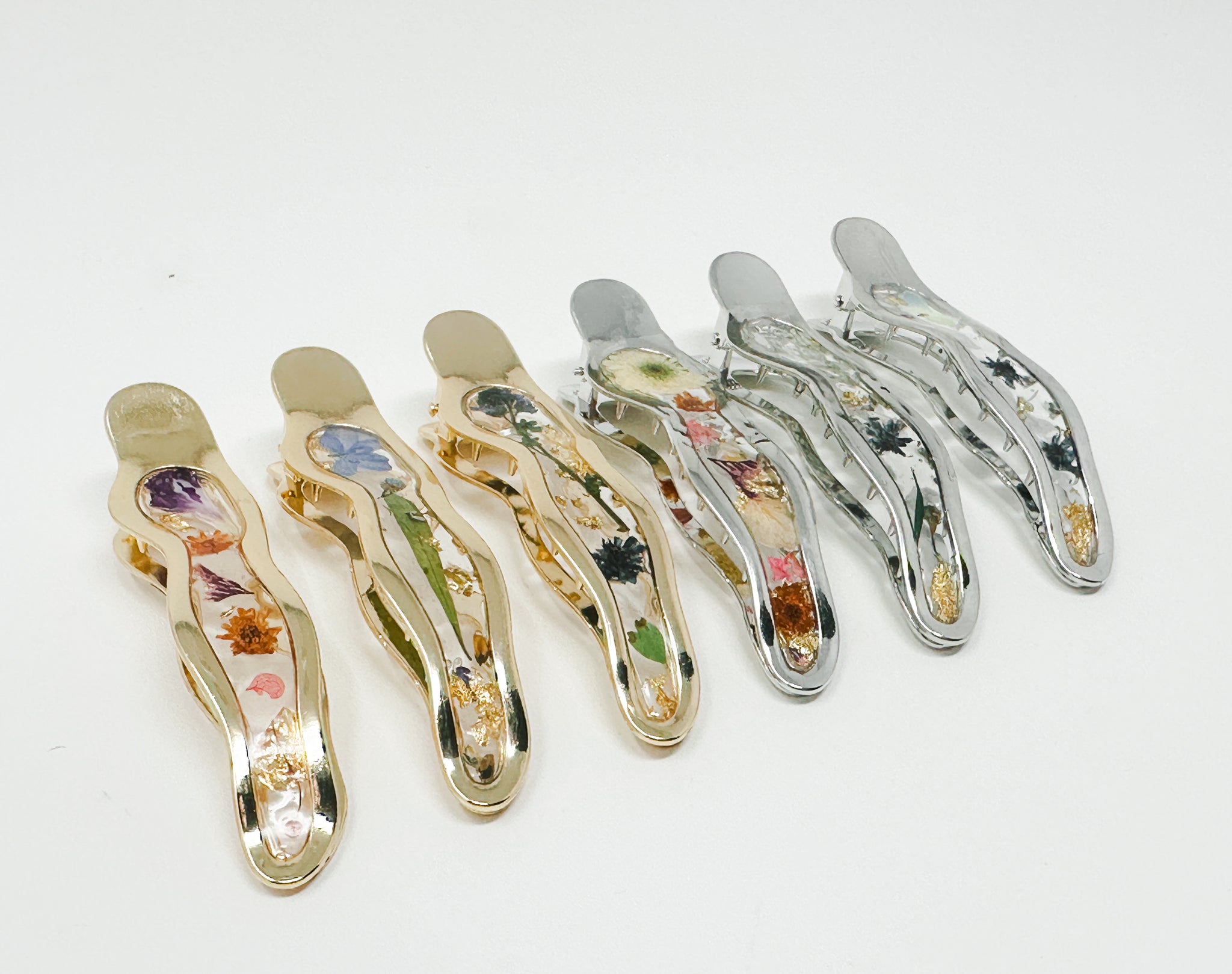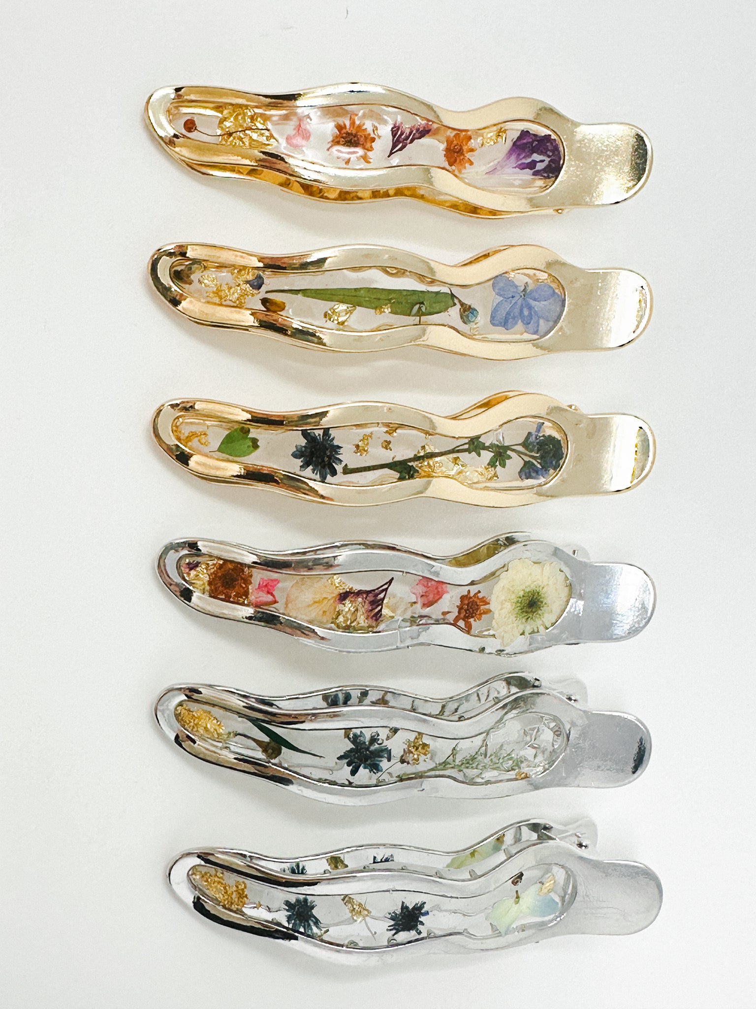 Flat metal barrette clip with real pressed flowers inside! Bring your half up styles to the next level. Perfect for dressing up or everyday!