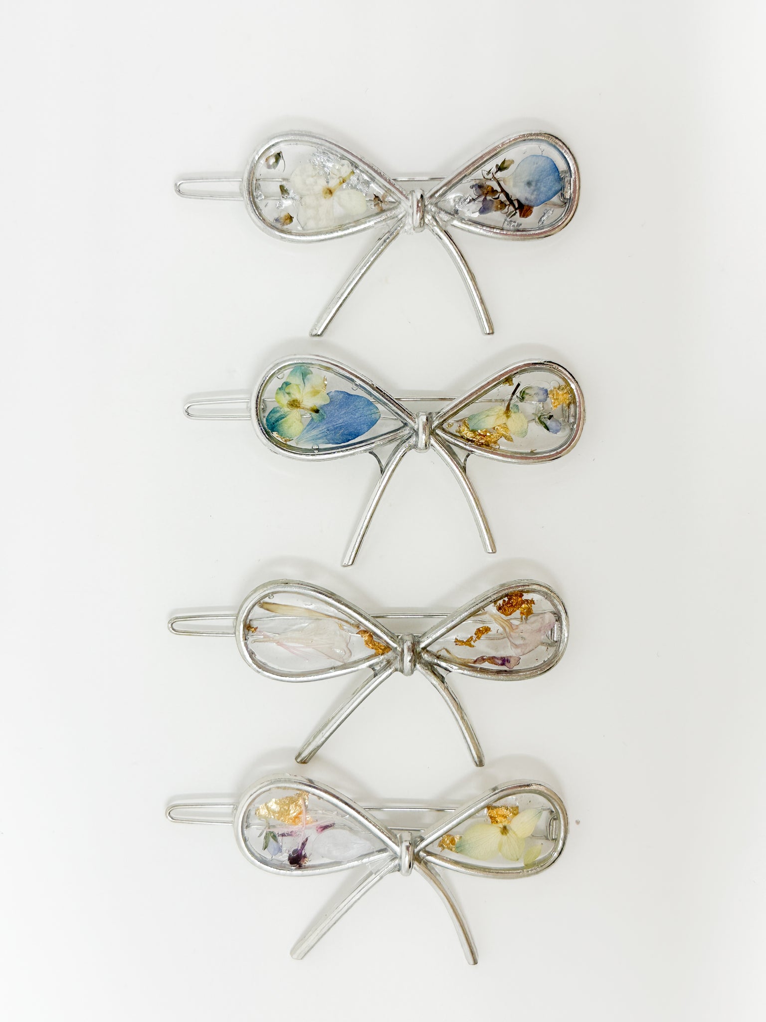 Small bow barrettes in silver and gold. Each barrette is filled with real pressed flowers. Each Bow is one of one! Chose between 7 options!