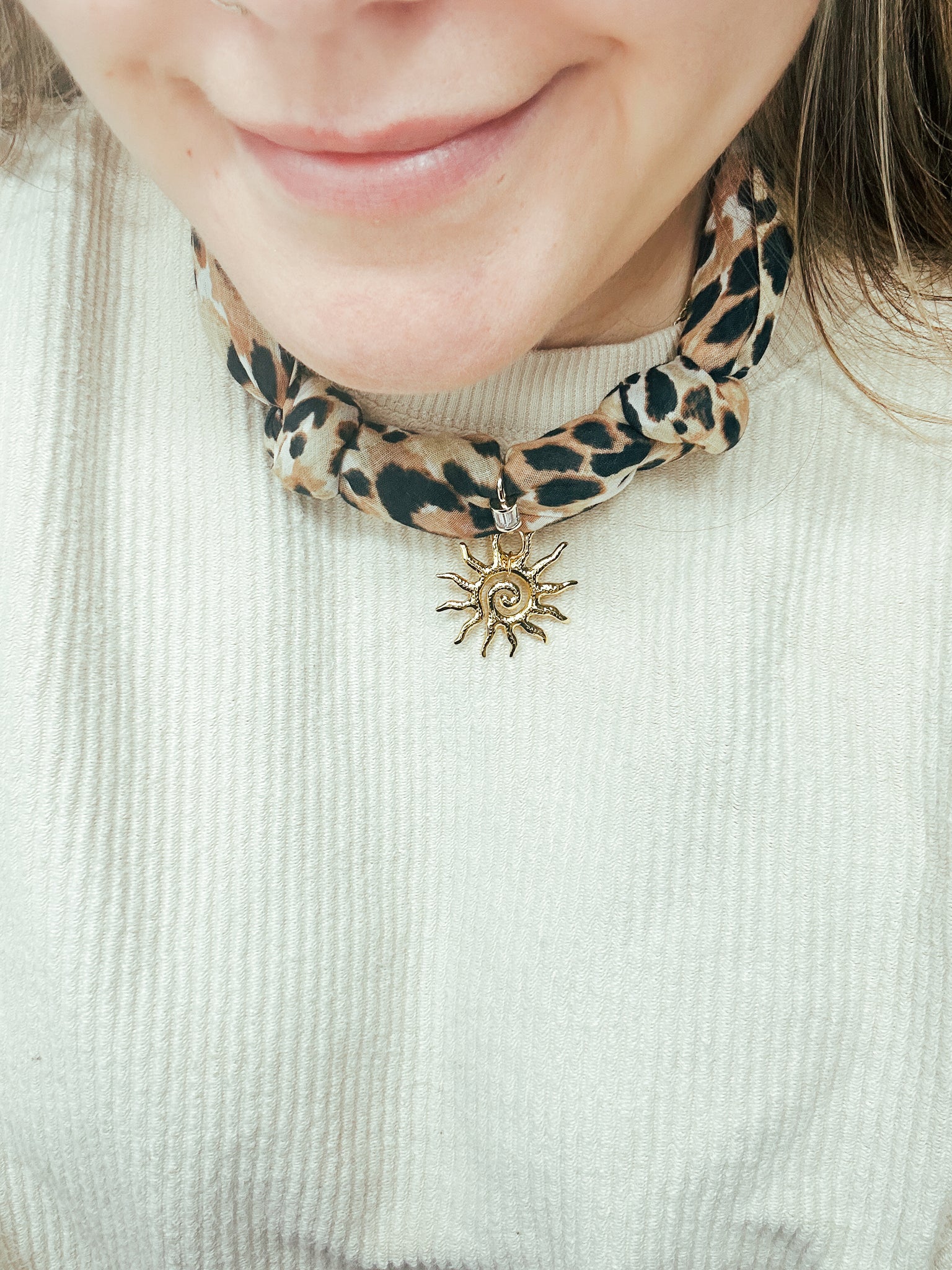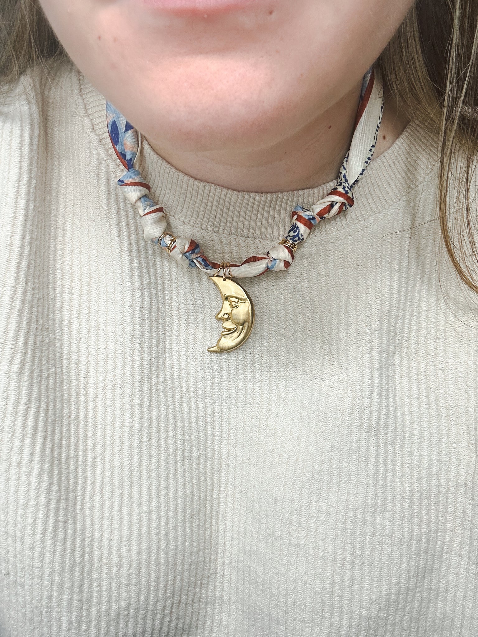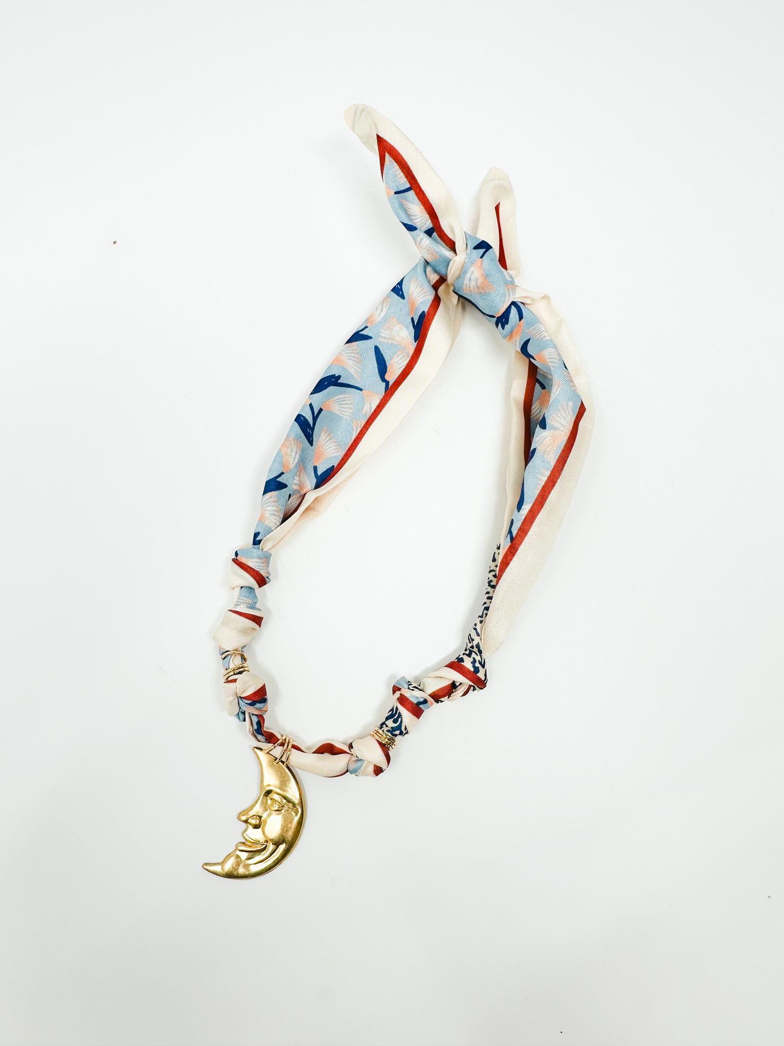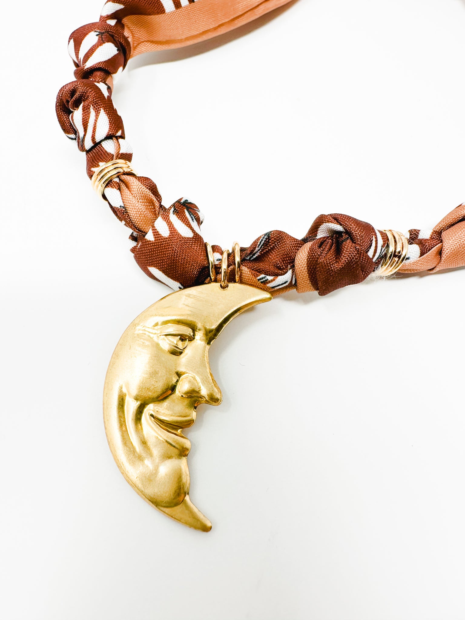 Bandana tie necklaces. No two are the same and there is only one of each available. Each necklace ties on and off with moon and sun brass charms.