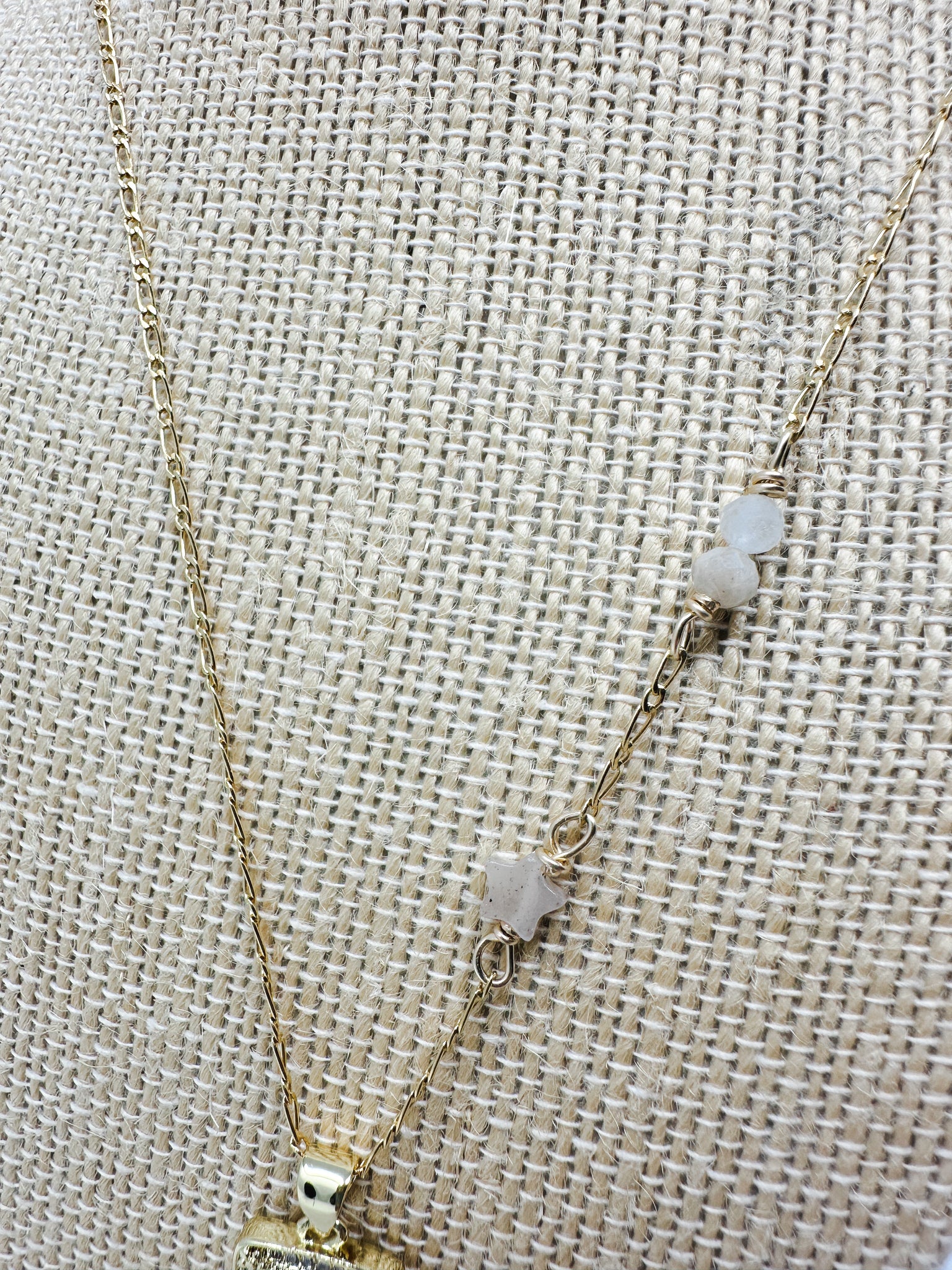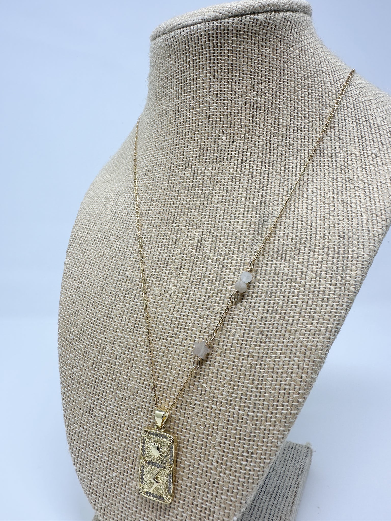 Details: 20’in gold filled necklace with rose quartz stones and a gold filled charm!